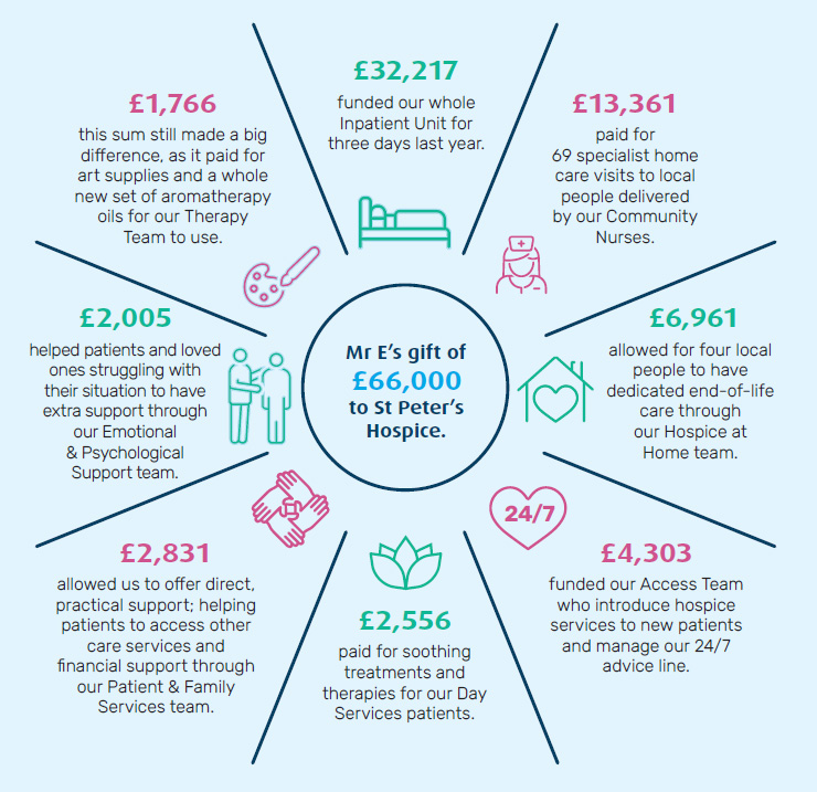 A Gift left in a Will supports local hospice care now – and for years in the future. Mr E very kindly left a gift of £66,000 to St Peter's Hospice. Here's how his generosity delivered – and is still delivering – vital care to local people.